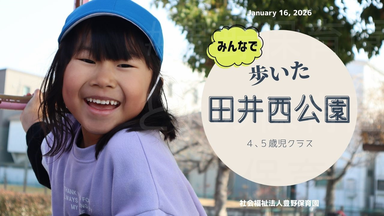 4,5歳児クラス田井西公園散歩:2026年1月16日 2026.01.17 ポカポカ冬散歩! 田井西公園へ散歩に行って来ました。長い距離にも関わらず頑張ってあるくことができました。公園ではポカポカ天気で身体を一杯動かすことができましたよ。 動画はインスタでUPしています。是非ご覧ください。 お断り フォトギャラリーの写真掲載は、行事や日常の保育の様子をお伝えするもので、 掲載写真に偏りが生じてしまいます。 また、写真に薄く「とよの保育園」と入れているのは転載防止のためです。 ご理解のほどよろしくお願いいたします。 ▼ 豊野保育園 クリスマス会 とよの保育園 クリスマス会