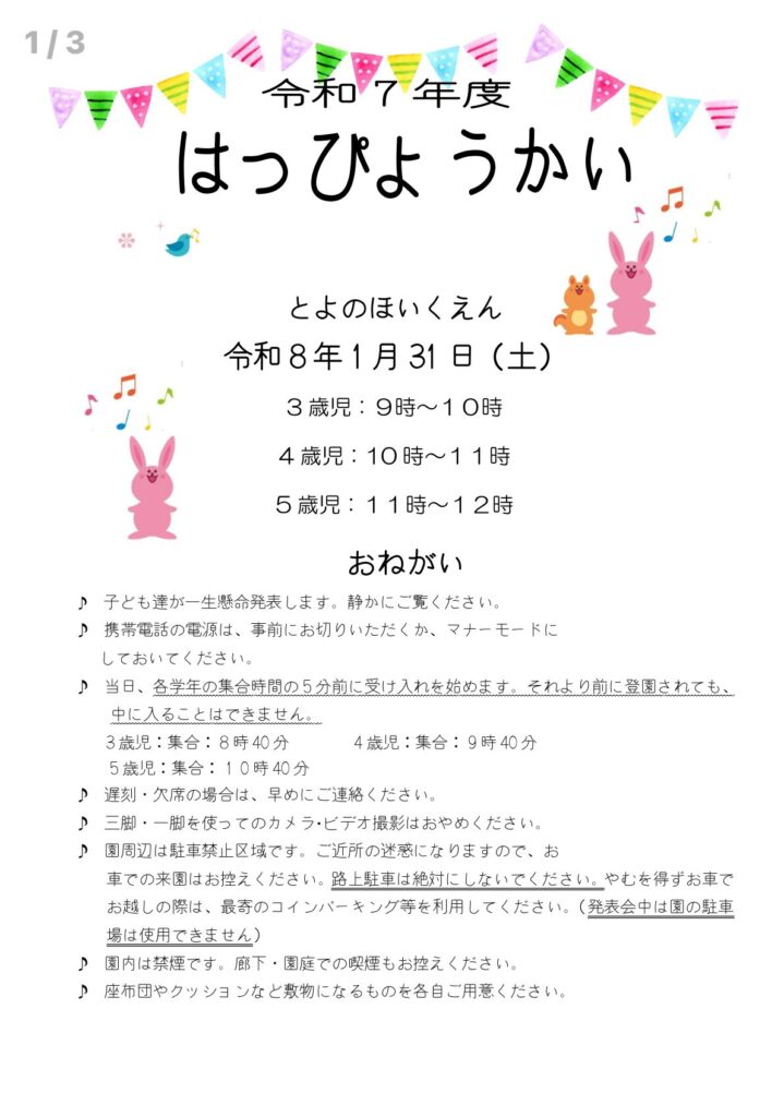 お知らせ:発表会(3,4,5歳児)のプログラムについて 2026.01.29 いつもお世話になっております。 ハグノートにて「発表会のプログラム」(全3ページ)を送付いたしました。 是非ご確認ください。 *「ハグノート」とは、保護者様と園との連絡ツールのことです。 *上記はプログラムの一部です。詳しくは、ハグノートをご確認ください。