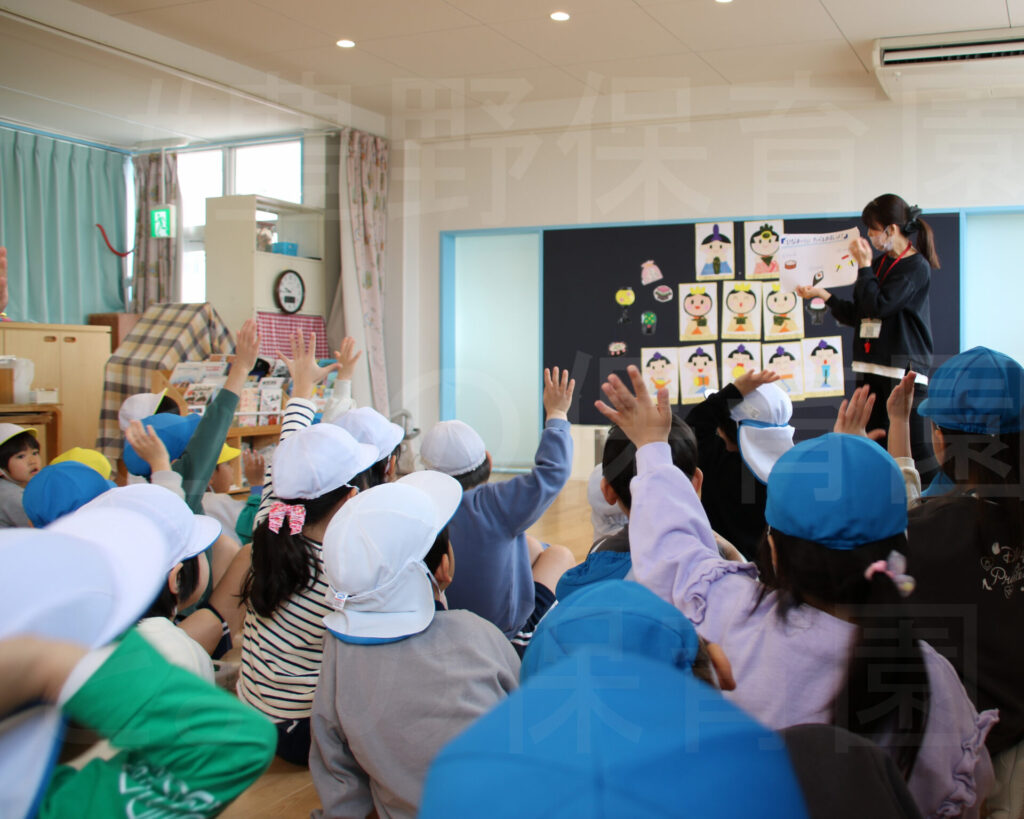 3,4,5歳児クラスさん、合同でひな祭りの行事を行いました!:2026年3月2日 2026.03.03 伝承行事を学び、楽しく遊びました! 今日はひな祭りの行事を幼児クラス合同で行いました。ひな祭りの由来と意味の説明を聞き、その後は皆で一緒にゲームで遊びましたよ。 動画はインスタでUPしています。是非ご覧ください。 お断り フォトギャラリーの写真掲載は、行事や日常の保育の様子をお伝えするもので、 掲載写真に偏りが生じてしまいます。 また、写真に薄く「とよの保育園」と入れているのは転載防止のためです。 ご理解のほどよろしくお願いいたします。 ▼ 豊野保育園 ひな祭り とよの保育園 ひな祭り