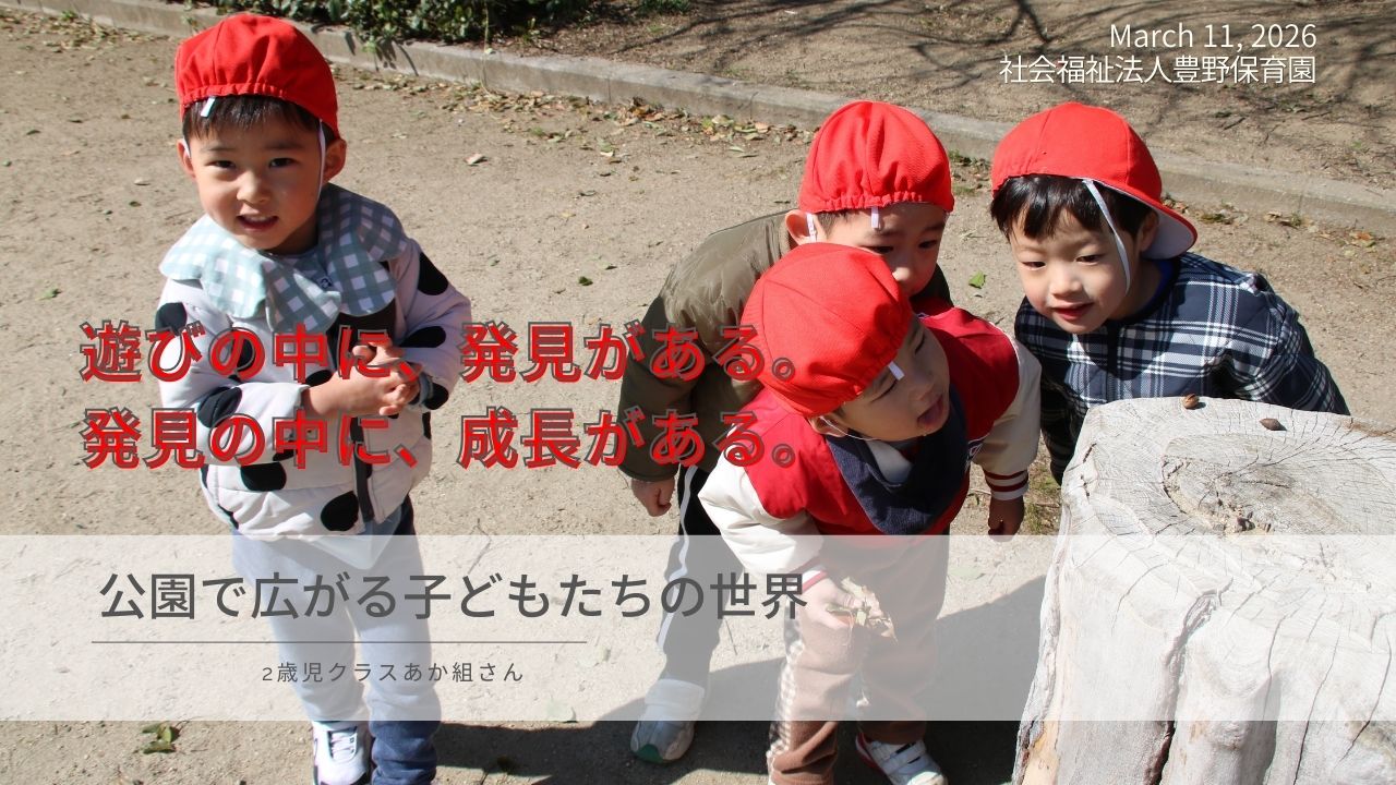 2歳児クラスあか組さん、初本町公園へ散歩に行きました!:2026年3月11日 2026.03.22 久しぶりの散歩です! 初本町公園へお散歩に行きました。公園では好きな遊具を順番交代を守って楽しんだり、ドングリや葉っぱを拾って「あったよ~」と見せ合っていたあか組さんでした。 動画はインスタでUPしています。是非ご覧ください。 お断り フォトギャラリーの写真掲載は、行事や日常の保育の様子をお伝えするもので、 掲載写真に偏りが生じてしまいます。 また、写真に薄く「とよの保育園」と入れているのは転載防止のためです。 ご理解のほどよろしくお願いいたします。 ▼ とよの保育園 散歩