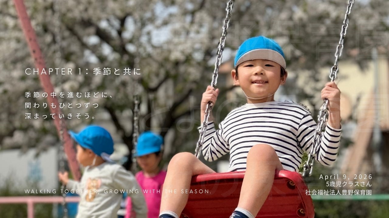 5歳児クラスさん、初本町公園へ季節を感じに散歩に出掛けました!:2026年4月9日 2026.04.10 進級して初めての散歩です! 初本町公園へ散歩に行きました。春らしい天気に元気一杯遊んできましたよ。行き帰りの歩行も大分上手になりました。 動画はインスタでUPしています。是非ご覧ください。 お断り フォトギャラリーの写真掲載は、行事や日常の保育の様子をお伝えするもので、 掲載写真に偏りが生じてしまいます。 また、写真に薄く「とよの保育園」と入れているのは転載防止のためです。 ご理解のほどよろしくお願いいたします。 ▼ 豊野保育園 散歩 とよの保育園 散歩